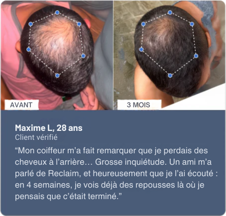 Reclaim fonctionne mieux quand on agit tôt, mais même si tu as perdu en densité, tant qu’il reste des follicules (même du duvet fin), ça aide à recréer un environnement plus sain pour ton cuir chevelu. L’important, c’est de rester proactif et de stopper la chute.